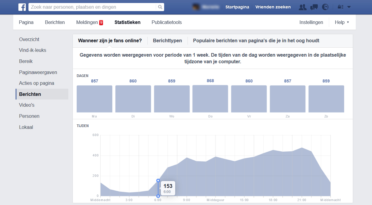In de statistieken kun je bij ‘berichten’ zien wanneer jouw fans online zijn. Handig natuurlijk om je volgende berichten op dat tijdstip te plaatsen (of in te plannen).