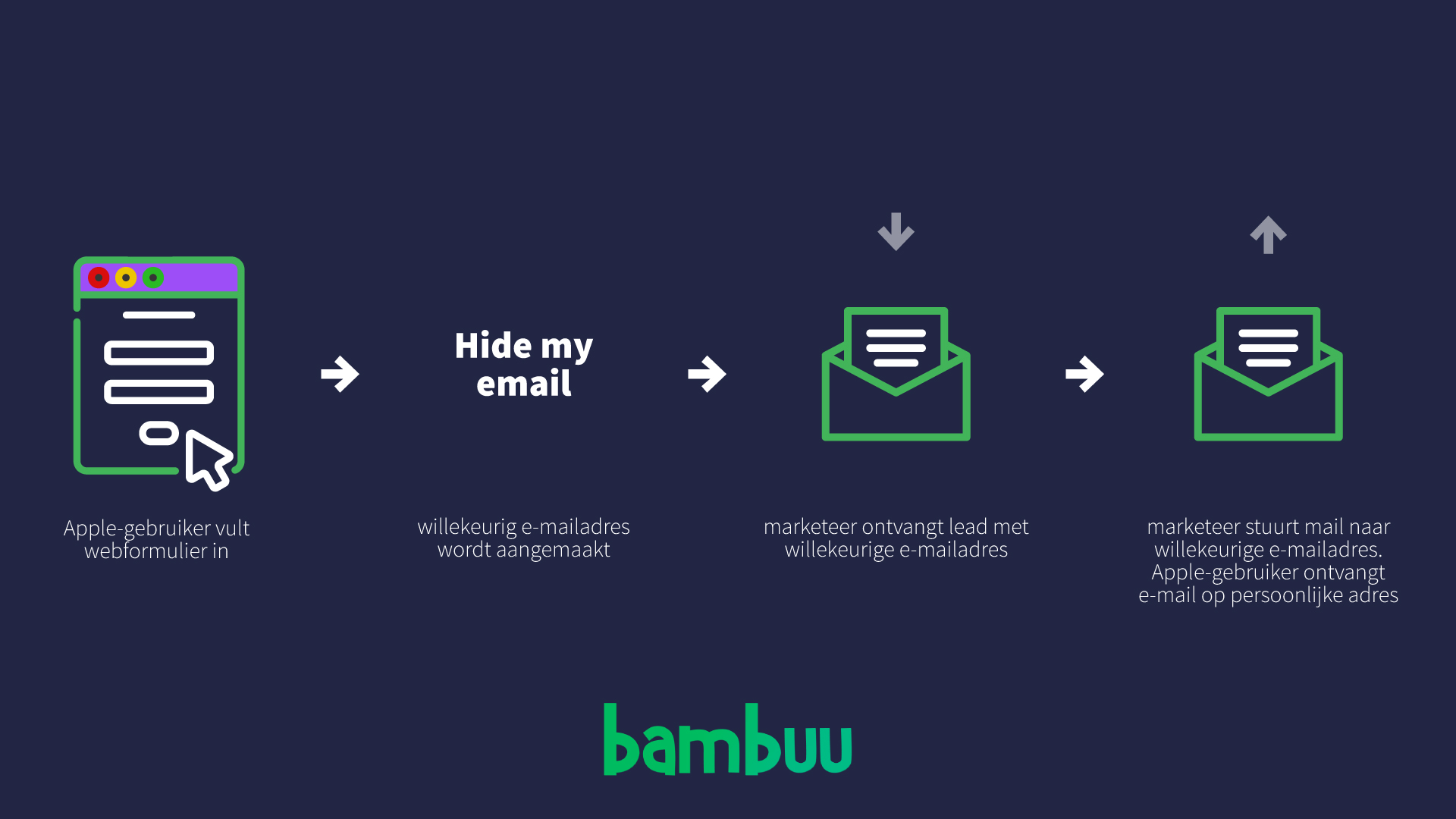 Heb je een online formulier waarbij je je e-mailadres in kunt vullen, dan krijgen Apple gebruikers de mogelijkheid om op Hide My Email te drukken. Vervolgens wordt er een willekeurig e-mailadres gegenereerd die aan het iCloud account wordt gekoppeld. Vervolgens wordt dit willekeurige e-mailadres in het formulier gebruikt en ingesteld als soort van redirect adres naar jouw persoonlijke e-mail. Als marketeer ontvang je dus een willekeurig e-mailadres, terwijl de lead/prospect jouw mail wel gewoon ontvangt.